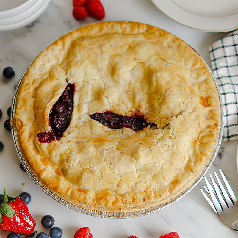Pictured below include Apple, Peach, Pecan, and Triple Berry. Also available but not pictured include, Blueberry, Blackberry, Bourbon Pecan, Cherry, Chocolate Pecan, Dutch Apple (Crumble), Dutch Cherry (Crumble), Egg Custard (Sept-Dec only), Peach-Raspberry (seasonal), Peach-Blueberry, and Pumpkin (Sept-Dec only). Also available in No Sugar Added - must be pre-ordered.
